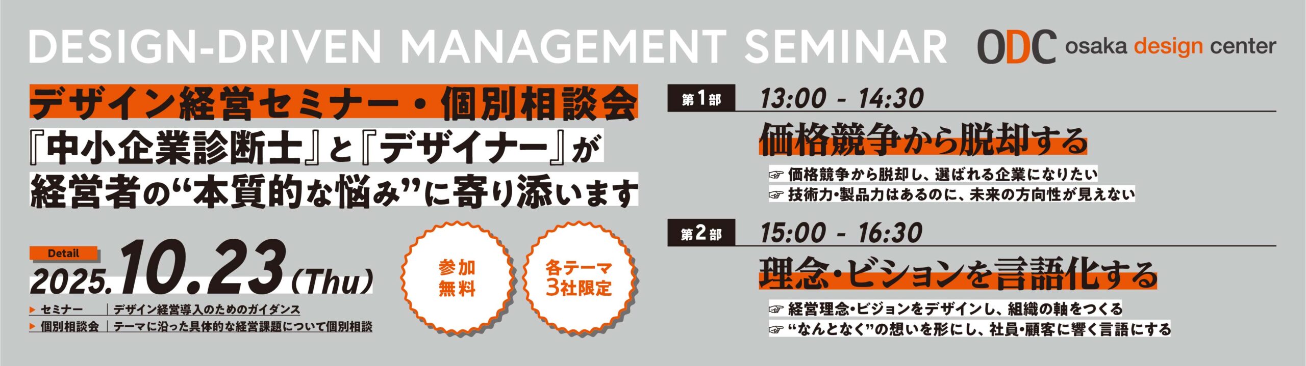 今回のセミナー・個別相談会では『価格競争から脱却する』『理念・ビジョンを言語化する』の2テーマを対象に、“大阪デザインセンター認定のデザイン経営パートナー”に具体的な経営課題の相談をすることができます。